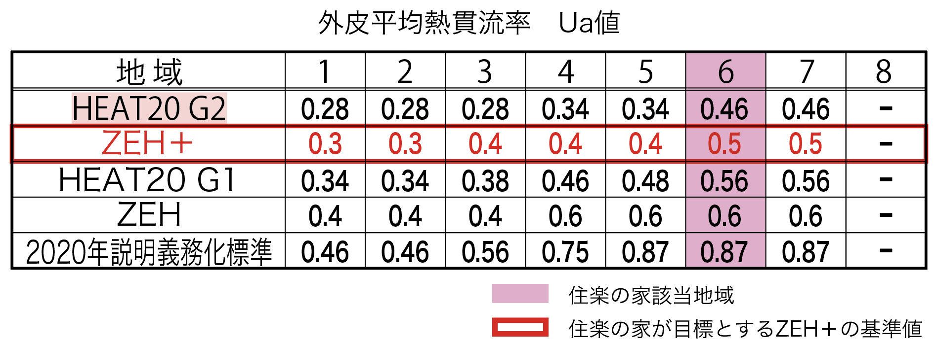 ZEHとグレード2 ZEH+です。今後、更にグレードが増えていくことを考慮してZEH<ZEH+の性能順序となっています。 住宅の外皮性能を示す値Ua値によって性能は決まります。